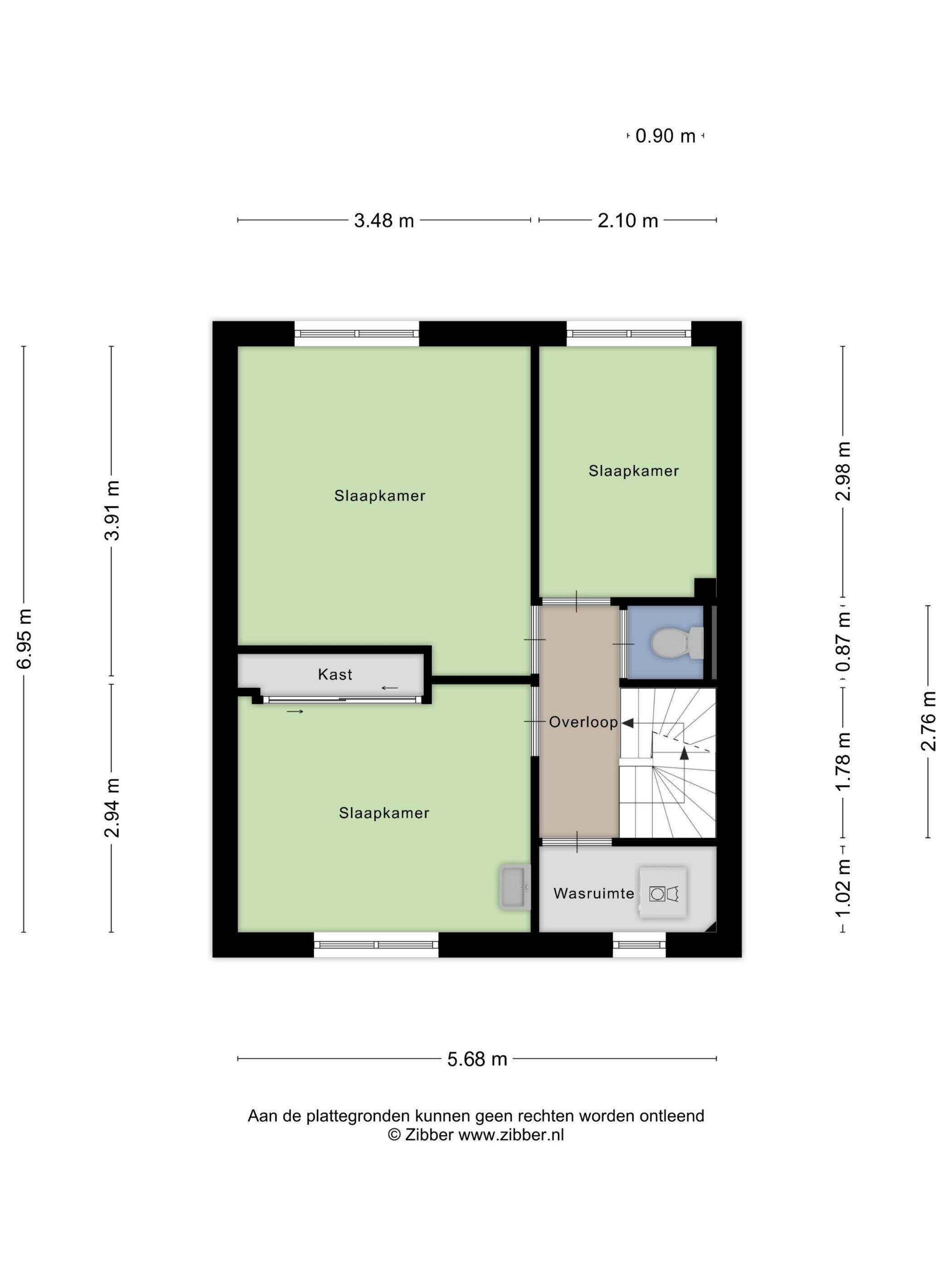 Overloop, twee ruime slaapkamers, separate toilet, werk/studeerkamer en wasruimte met aansluitingen voor droger/wasmachine.